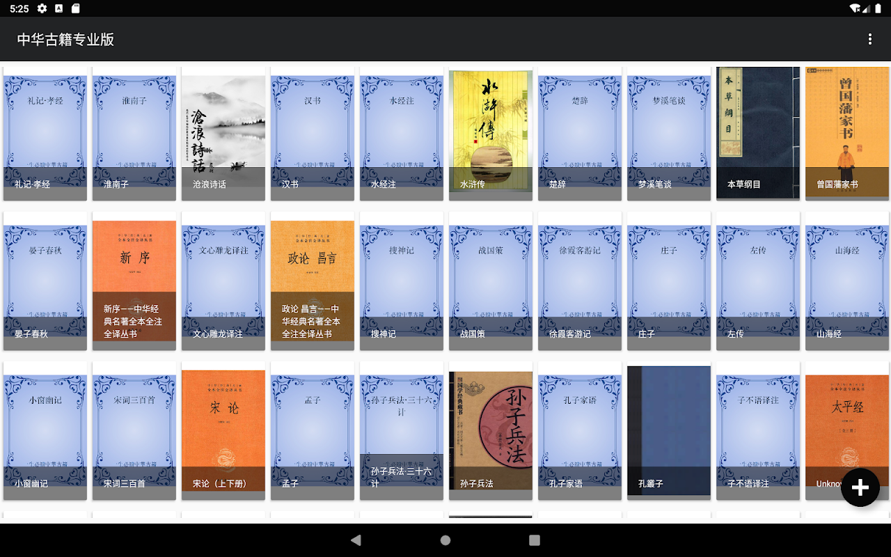 《商 书》,《政论-昌言》,《中庸》,《六韬》,《列子》,《反经》,《史记》,《周易》,《国语》,《墨子》,《孟子》,《左传》,《庄子》,《新序》,《楚辞》,《汉书》,《管子》,《老子》,《荀子》,《论语》,《诗品》,《诗经》,《道枢》,《礼记·孝经》,《茶经·随园食单》,《三国志》,《人物志》,《全宋词》,《千家诗》,《后汉书》,《商君书》,《太平经》,《孔丛子》,《山海经》,《战国策》,《搜神记》,《水浒传》,《水经注》,《淮南子》,《红楼梦》,《菜根谭》,《西游记》,《道德经》,《韩非子》,《鬼谷子》,《金刚经·心经·坛经》,《地藏经·药师经》,《西厢记·窦娥冤》,《三字经·百家姓千字文·弟子规》,《三国演义》,《世说新语》,《乐府诗集》,《了凡四训》,《人间词话》,《古文观止》,《吕氏春秋》,《四书五经》,《围炉夜话》,《大学中庸》,《孔子家语》,《孙子兵法》,《小窗幽记》,《晏子春秋》,《本草纲目》,《梦溪笔谈》,《纳兰词集》,《聊斋志异》,《贞观政要》,《资治通鉴》,《闲情偶寄》,《陶庵梦忆》,《随园诗话》,《颜氏家训》,《鲁迅文集》,《黄帝内经》,《孙子兵法·三十六计》,《元曲三百首》,《周易参同契》,《唐诗三百首》,《子不语译注》,《宋词三百首》,《徐霞客游记》,《曾国藩家书》,《群书治要译》,《古诗十九首·玉台新咏》,《九章算术译注》,《古列女传译注》,《吴越春秋译注》,《四書章句集註》,《文心雕龙译注》,《沧浪诗话评注》,《西京杂记译注》,《西湖梦寻评注》,《阅微草堂笔记》,《东京梦华录译注》,《宋论(上下册)》,《金瓶梅词话(梦梅馆校本)》
