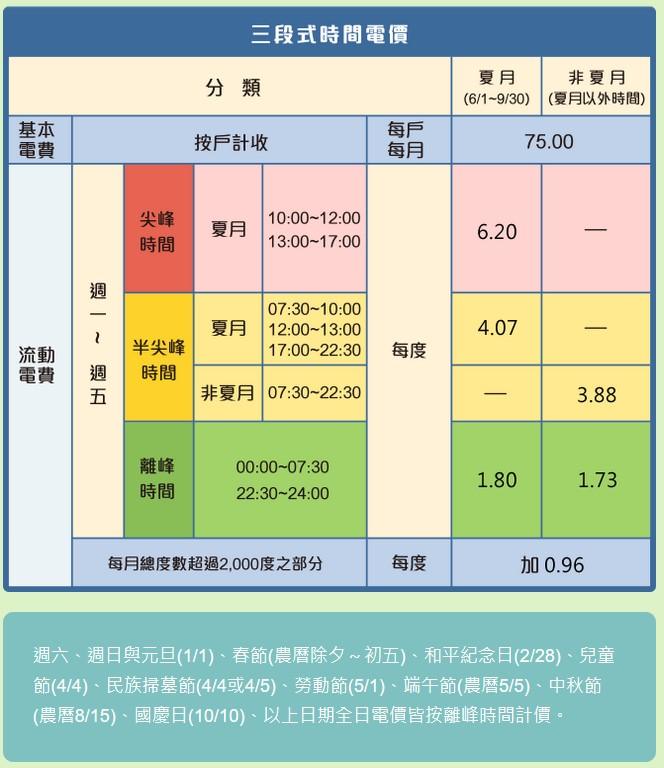 為反映尖峰、半尖峰、離峰不同時間的供電成本,因此訂定不同費率,尖峰時間電價最高,離峰時間最低,用電規模較大(例如每月超過700度)的用戶,建議可評估選用時間電價,藉由調整用電時間,將尖峰用電移轉至離峰時間使用,以達充分利用離峰電力與節省電費支出之目的。