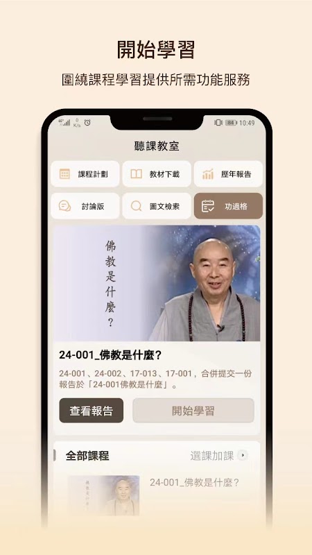 "বুদ্ধ এডুকেশন নেটওয়ার্ক একাডেমি" অ্যাপটি পুরানো ভিক্ষু জিংকং-এর "নয় বছরের শিক্ষাদান" এর শিক্ষাগুলি অনুসরণ করে৷ কোর্সগুলি মূলত অনলাইন বক্তৃতার উপর ভিত্তি করে, এবং শিক্ষার্থীরা একটি পরিপূরক হিসাবে একে অপরের সাথে আলোচনা করে৷ শিক্ষণ পদ্ধতি হল একটি গভীর, দীর্ঘমেয়াদী অধ্যয়ন ব্যবহার করা এবং ধর্মগ্রন্থ শোনার উপর ফোকাস করা। প্রতিটি কোর্সের পরে, শিক্ষাগত কৃতিত্ব হিসাবে শেখার অভিজ্ঞতার একটি প্রতিবেদন জমা দিতে হবে। প্রতি বছর কোর্স শেষ করার পরে, আপনি আপগ্রেড করতে পারেন এবং অধ্যয়নের পরবর্তী পর্যায়ে প্রবেশ করতে পারেন। অনলাইনে একসাথে অধ্যয়ন করতে, একে অপরকে উত্সাহিত করার জন্য সবাইকে স্বাগত জানাই, এবং আপনি শেখার ক্ষেত্রে একা থাকবেন না।