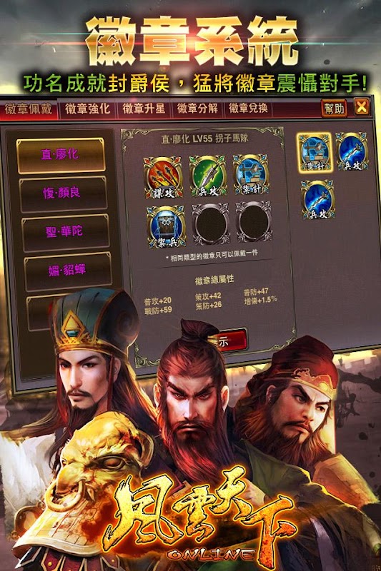三國時代的冷兵器戰爭來說,兵種、陣型與戰法永遠是直面決勝的關鍵!作為戰爭的操控者,你如何挑選出陣將領和行兵佈陣,將成為制勝的關鍵!