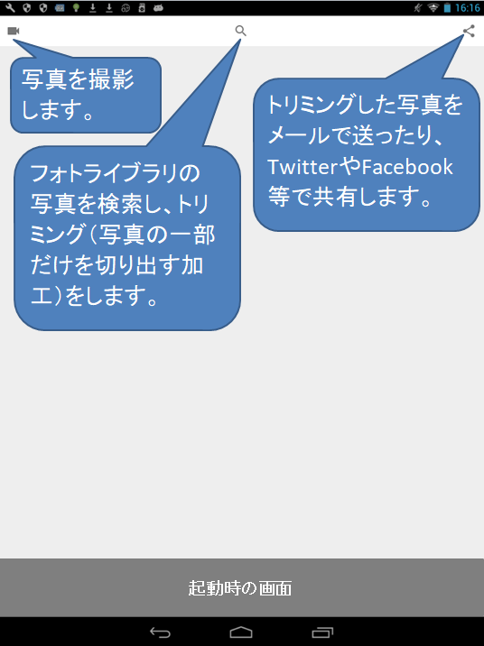 トリミングした写真をメールで送ったり、TwitterやFacebookで共有したり、プリンタで印刷します。