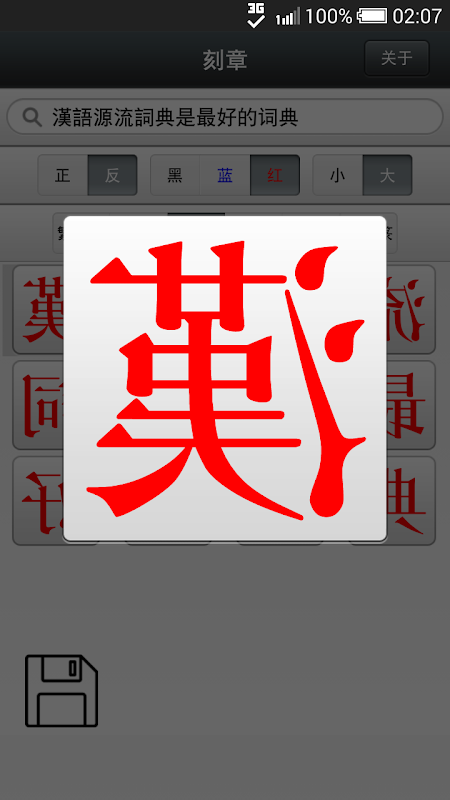 此app用于刻章、刻字、练习书法之用。支持繁体、简体字查询。支持的字体有:繁楷体、简楷体、繁宋体 、简宋体、隶书繁、繁印篆共6种。