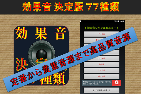 効果音77種類をアプリにて提供。 ジャンル別に効果音を振り分けてあるから使いやすい。 クイズ、宴会、肝試し、アニメ等、クリアなリアル音質ですぐに使える便利さ。