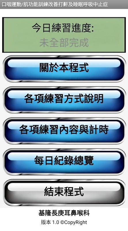 সতর্কতা: স্লিপ অ্যাপনিয়া একজন ডাক্তারের দ্বারা মূল্যায়ন ও নির্ণয় করা প্রয়োজন এবং চিকিত্সার পদ্ধতিগুলি সুপারিশ করা হয়েছে। এই প্রোগ্রামটি শুধুমাত্র সহায়ক স্ব-ব্যায়াম রেকর্ডের রেফারেন্সের জন্য। ব্যবহারের আগে, এটি এখনও একজন ডাক্তার দ্বারা মূল্যায়ন করা প্রয়োজন। এই প্রশিক্ষণের উপর নির্ভর করবেন না। স্লিপ অ্যাপনিয়া উন্নত করার জন্য অন্যান্য পদ্ধতি উপেক্ষা না করে। , বিকাশকারী কোন সম্ভাব্য ডেরিভেশনের জন্য দায়ী থাকবে না।