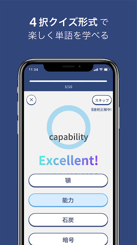 কুইজ ফরম্যাটে জুনিয়র হাই স্কুল থেকে বিশ্ববিদ্যালয় প্রবেশিকা পর্যন্ত ইংরেজি শব্দ (বর্তমানে ২ হাজার শব্দ)। আমরা প্রতিক্রিয়া সময় অনুযায়ী তাদের র্যাঙ্ক করি, সুতরাং যারা "উত্তম!" দিয়ে উত্তর দিতে চান তাদের সঠিক উত্তর দিতে চান তাদের কাছ থেকে