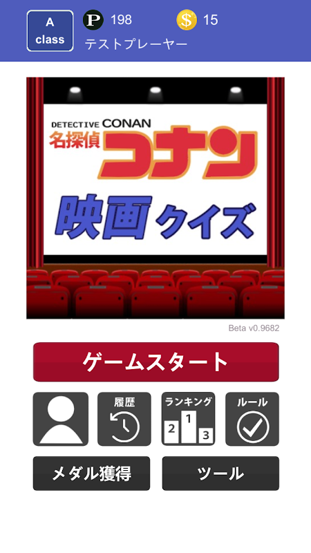 アプリ内で無料で獲得できるメダルを使用してチャレンジするクイズ(コナン映画クイズ)となります。検定クイズは5~1級まであり、5級は3問中1問、4級は5問中2問、3級は7問中3問、2級は7問中5問、1級は7問全問正解で合格となります。1級の獲得を目指しましょう。