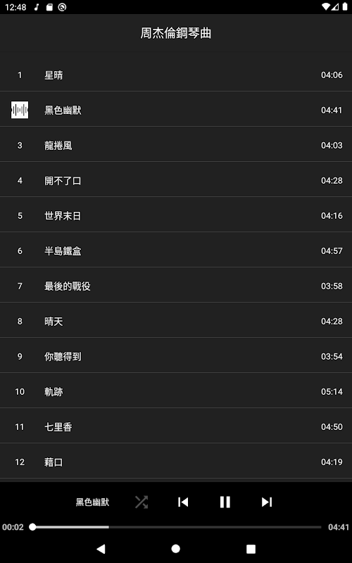 সর্বাধিক সংক্ষিপ্ত এবং সহজেই ব্যবহারযোগ্য মিউজিক অ্যাপ্লিকেশন, জে চৌয়ের ক্লাসিক গান থেকে অভিযোজিত পিয়ানো সংগীত শুনতে বিনামূল্যে। বর্তমানে অন্তর্ভুক্ত গানের মধ্যে রয়েছে: