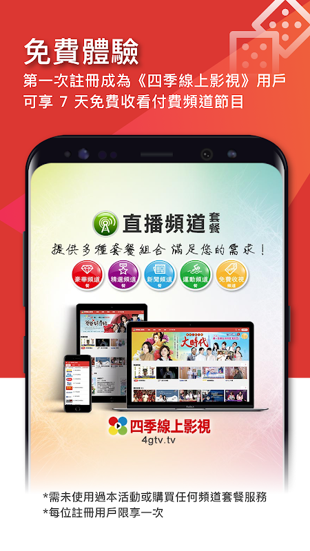 第一次註冊成為《四季線上影視》用戶,只要未使用過本活動或購買任何頻道套餐服務,即可享 7 天免費收看頻道節目(每位註冊用戶限享一次)