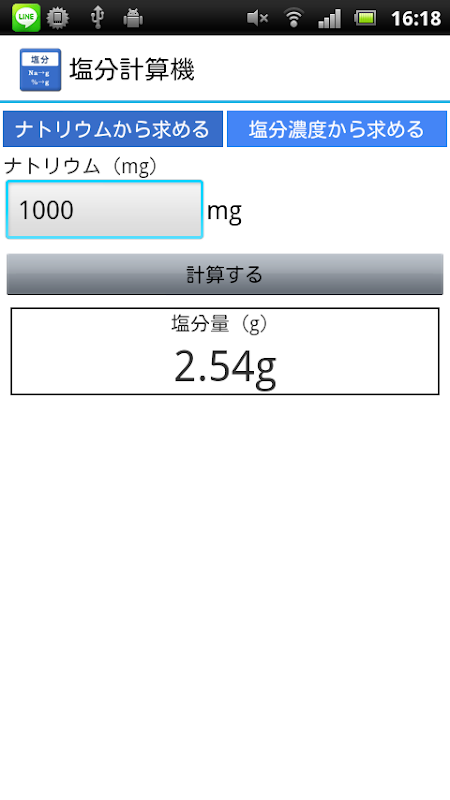 1.ナトリウム(mg)を入力し、「計算する」ボタンを押す。