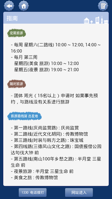 此应用程序详细介绍了大邱中区近代胡同游5个旅游线路和主题旅游线路,并提供无导游自行寻路功能、周边信息查询功能、可以写游记的旅行手册功能等多个功能。