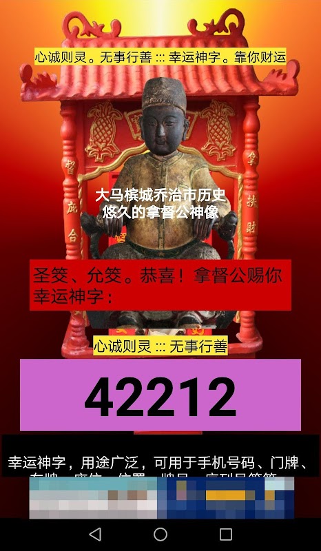 这款大马拿督公幸运神字,特别收录了大马槟城乔治市一座拿督公庙里上百年历史的拿督公神像。这款手机应用程式,可以求:千字(3D)、万字(4D)、十万字(5D)和百万字(6D)。