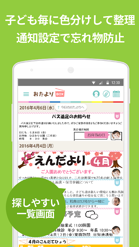 ・お子さん毎におたよりを色分けして整理、顔写真も設定可能