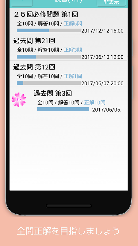 ・復習では未解答問題、不正解問題、正解済み問題、付箋をつけた問題のみを選択でき、何度でも復習できます