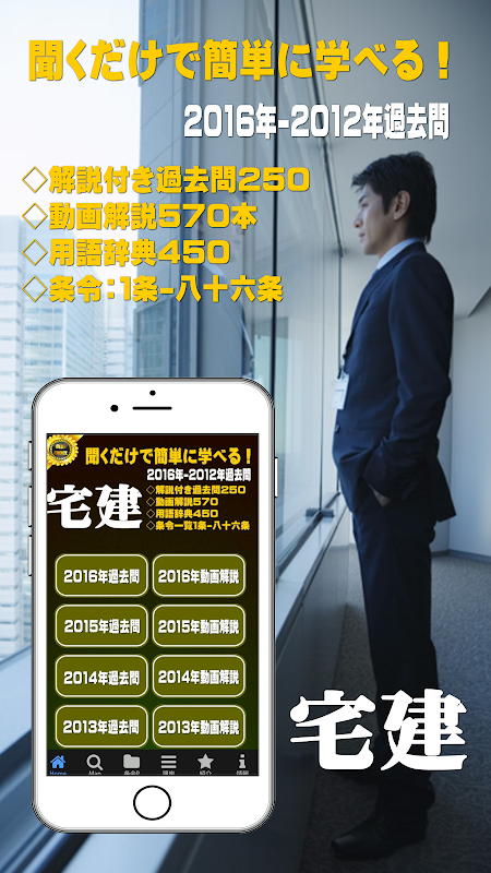 人気ランキング5位の宅建、5年分の過去問(2012年-2016年)に解説を付けました、ですから見やすく、分かりやすく、覚えやすい。通勤、通学の合間時間を使って動画解説を聞き流してください、本気で学んでいるあなたの合格をサポートします。