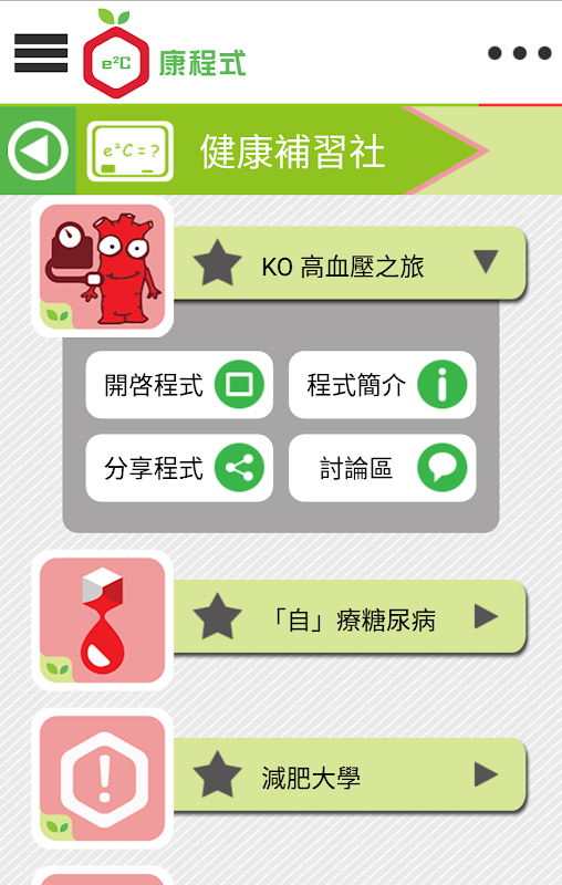 健康補習社—針對個別疾病而設的自我管理電子學習系統,主要使用對象包括高血壓患者、糖尿病患者、超重或肥胖者、中風病人及照顧者。