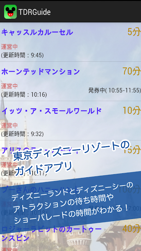 東京ディズニーリゾート(TDR)のアトラクションの待ち時間や、ショー・パレードの時間、キャラクターグリーティングの時間、本日のパーク情報を見ることができる、ディズニーの待ち時間アプリです。