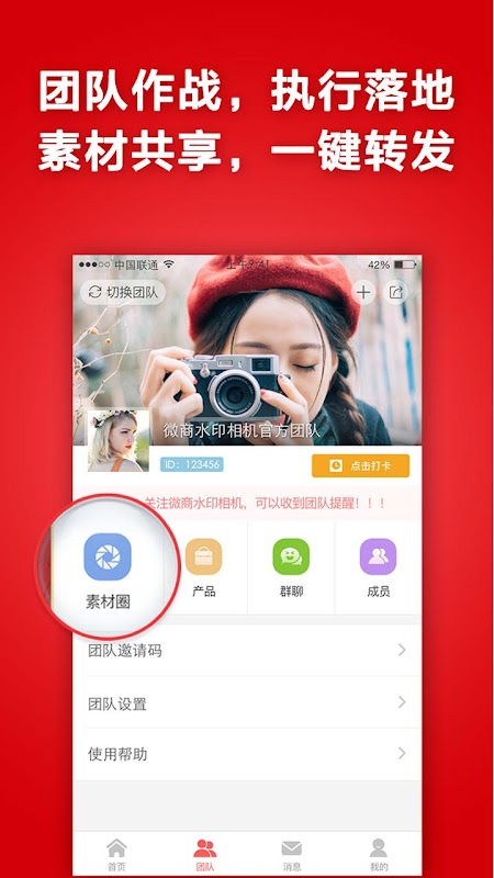 微商水印相机,批量水印、视频水印、视频拼图、团队素材下发,持续解决微商痛点,一键转发素材图片到朋友圈!省去”素材号“的繁琐,大大提高微商团队工作效率,过千万微商的选择!
