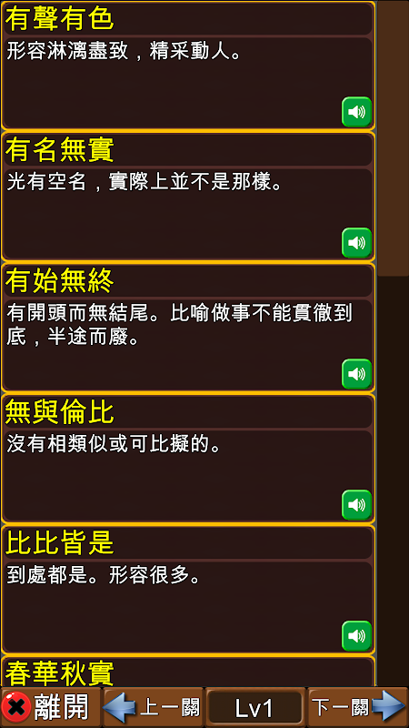 আইডিয়ামস সলিটায়ার-ফিল-ইন-ও দেখুন গেমটি মূলত চাইনিজ ফোর-চরিত্রের আইডিয়ামগুলি বা সাধারণত ব্যবহৃত শব্দভাণ্ডার দ্বারা রচিত হয় খেলোয়াড়রা ক্রসওয়ার্ড ধাঁধা আকারে চীনা চার অক্ষরের শব্দভান্ডার শিখতে পারে যা একটি মজাদার শেখার অভিজ্ঞতা।