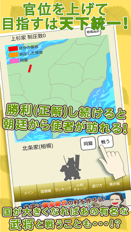 আপনি উপাধিতে আগ্রহী হন বা না হন, এটি একটি কুইজ গেম অ্যাপ যেখানে আপনি সেনগোকু এবং এডো পিরিয়ডে সেট করা কুইজগুলি নিতে পারেন, আপনার দেশ বাড়াতে পারেন এবং বিশ্বকে একত্রিত করতে পারেন। র্যাঙ্কিংয়ে, জাপানের ``শক্তিশালী দেশগুলো' অফিসিয়াল র্যাঙ্ক, দেশের চুরির সংখ্যা, দমনের সংখ্যা, ভাসালের সংখ্যা, কোবানের সংখ্যা ইত্যাদির ক্ষেত্রে একে অপরের বিরুদ্ধে প্রতিদ্বন্দ্বিতা করতে পারে। সেনগোকু পিরিয়ডের কুইজের উত্তর দিন এবং একটি দেশের বৃদ্ধির আসল রোমাঞ্চ অনুভব করুন। হিট গেম ``আসুন একটি সেনগোকু গ্রাম তৈরি করি!'' এর পর এটি দ্বিতীয় গেম, একটি ``সেনগোকু কুইজ টাইপ ওয়ার্ল্ড ইউনিফিকেশন সিমুলেশন অ্যাপ'' যা সেনগোকু আমলে সেট করা হয়েছিল, যেটিতে সামরিক বাহিনীর আধিপত্য ছিল।