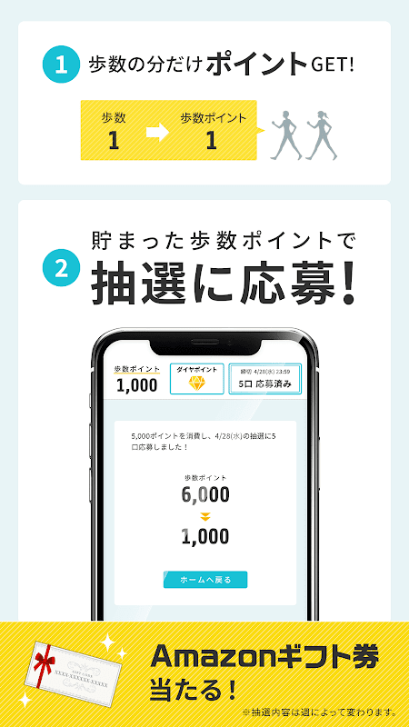 এটি একটি poi-katsu অ্যাপ যা আপনাকে হাঁটার সময় আপনার জমা হওয়া পয়েন্টগুলি ব্যবহার করে Amazon উপহারের শংসাপত্র জেতার জন্য লটারির জন্য আবেদন করতে দেয়৷