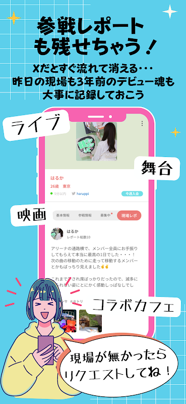 এটি একটি শুধুমাত্র মহিলাদের জন্য ওটাকু ম্যাচিং অ্যাপ যা আপনাকে কনসার্টে লোকেদের সাথে যেতে, পণ্য বিনিময় করতে এবং একটানা টিকিট, ট্রিপ এবং ক্যাফে হপিং উপভোগ করতে দেয়।