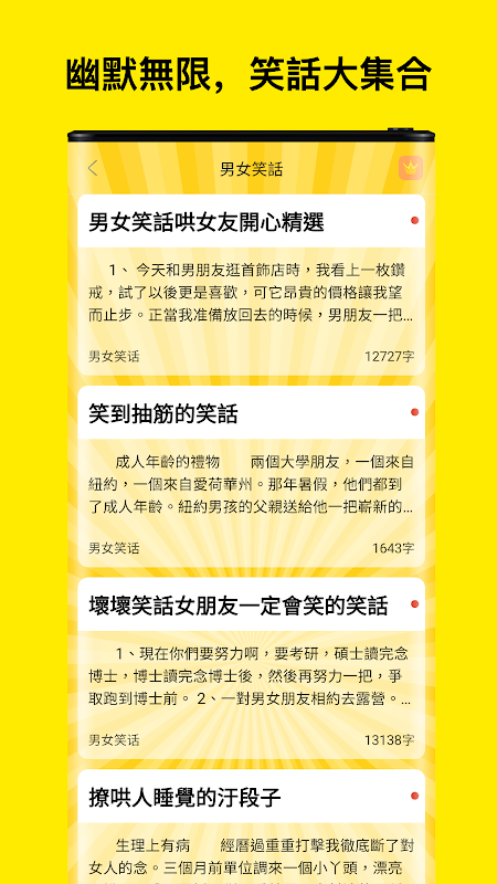 আমরা বিভিন্ন ধরনের কৌতুক বিষয়বস্তু সংগ্রহ করেছি, যার মধ্যে ছোট জোকস, মজার জোকস, ক্লাসিক জোকস, পুরুষ ও মহিলাদের কৌতুক, হাসিখুশি জোকস, দম্পতি জোকস, কনট্যাটিভ জোকস, বাচ্চাদের কৌতুক, ঠান্ডা কৌতুক, হাস্যরসাত্মক কৌতুক এবং অবন্তী জোকস সহ কিন্তু সীমাবদ্ধ নয়। প্রতিটি ধরণের কৌতুক সাবধানতার সাথে নির্বাচন করা হয়েছে যাতে আপনি এমন সামগ্রী খুঁজে পেতে পারেন যা আপনি প্রতিবার APP খুললেই আপনাকে হাসাতে হবে।