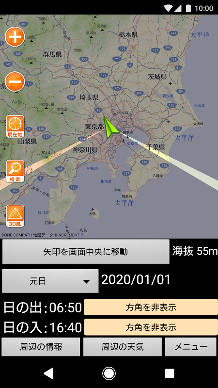 その場所の標高も加味して、日の出と日の入の時刻とともに、地図上で方角を表示。