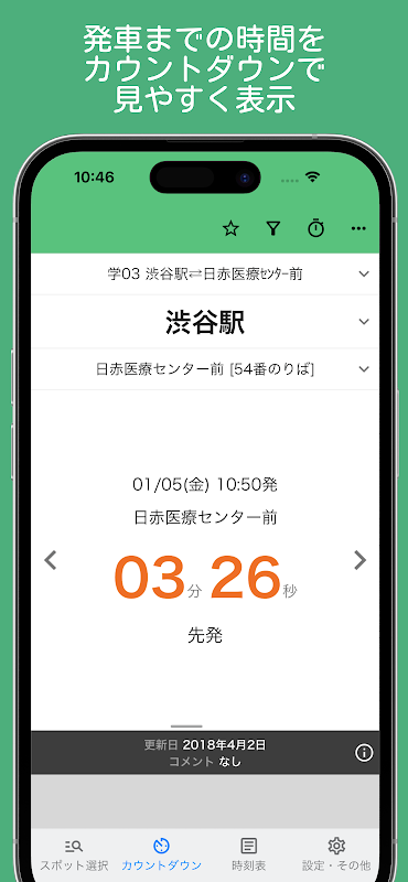 ・カウントダウン画面に表示されている日付をタップすると、カウントダウンする時刻表の曜日を変更できるようになりました。お盆期間中などダイヤが普段と違う場合にご利用いただけます。