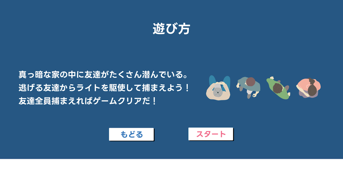 গেমের প্রবাহটি হল যে 3-সেকেন্ডের গণনার পরে প্লে স্ক্রিন শুরু হয় এবং অনেক বন্ধু একটি পিচ-কালো ঘরে লুকিয়ে থাকে।