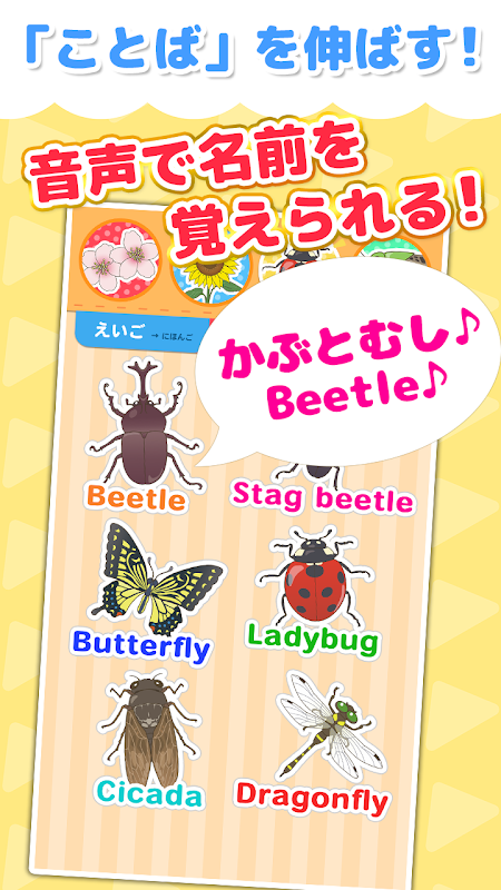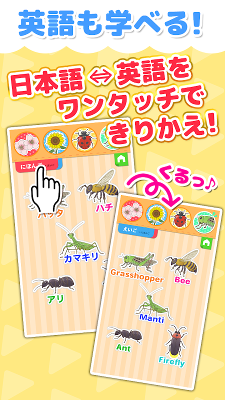 পরিচিত ফুল এবং পোকামাকড় সঙ্গে মজা শেখার আছে! ইংরেজি এবং জাপানি অডিও সহ শিক্ষামূলক অ্যাপ!