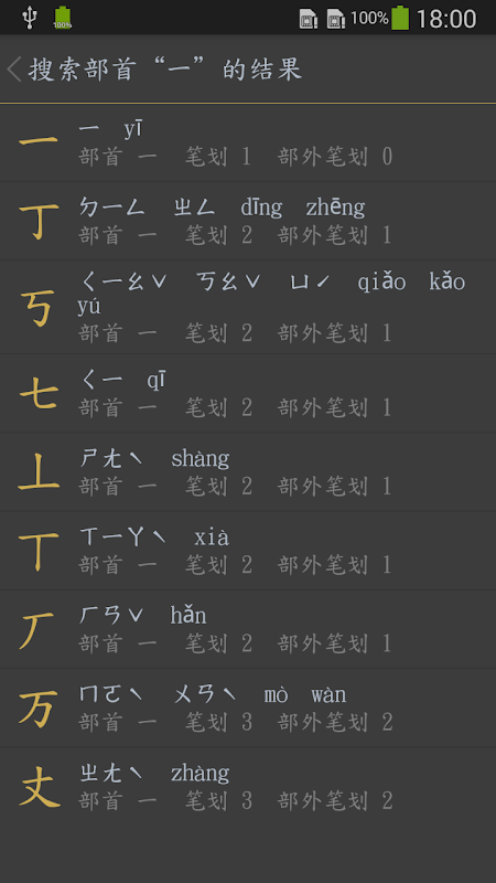 2. "一%" অনুসন্ধান করলে "一" শব্দ দিয়ে শুরু হওয়া সমস্ত এন্ট্রি পাওয়া যাবে;