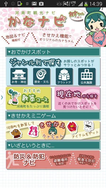 大阪 河南町があなたに贈るステキなアプリが誕生しました。 河南町の観光・防災マップの閲覧や、イメージキャラクターのカナちゃんの着せ替えゲームを楽しめます。