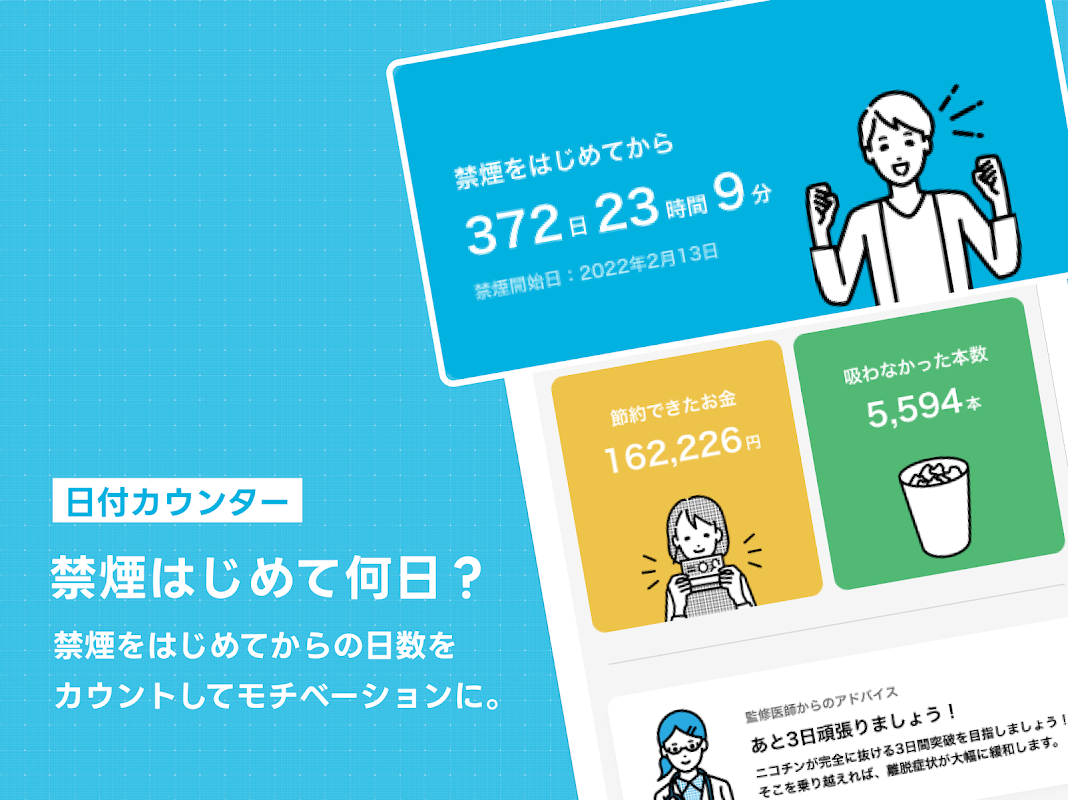 ধূমপান পরিপূরক ধূমপান অব্যাহত রাখার জন্য একটি অ্যাপ। ধূমপান ত্যাগ করার জন্য একাগ্রতা এবং ধারাবাহিকতা প্রয়োজন, তবে এই অ্যাপটির সাহায্যে আপনি সহজেই চালিয়ে যেতে পারেন এবং এটি একটি অভ্যাস করে তুলতে পারেন। ধূমপান ছাড়ার বিষয়ে তথ্য এবং পরামর্শ ডাক্তারের কাছ থেকে দেওয়া হবে, তাই এমনকী যারা ধূমপান ছাড়ার বিষয়ে আত্মবিশ্বাসী নন তারাও মানসিক শান্তি নিয়ে কাজ করতে পারেন।