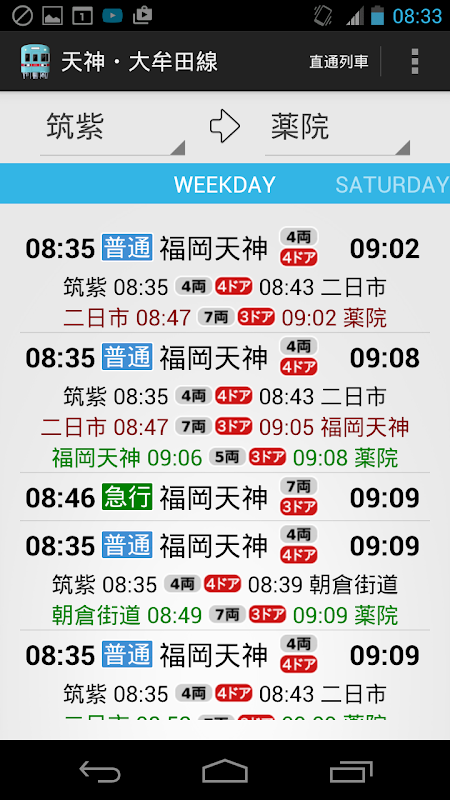 例えば、三沢駅で「普通」を乗って、筑紫駅で「急行」に乗り換えますか、それとも二日市駅で「特急」に乗り換えますか、分かり憎いです。平尾駅から南に行く場合は時々大橋駅で「急行」に変わりますけど、これの代わりに薬院駅まで戻れば「特急」も可能です。