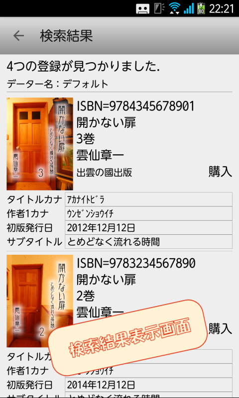 検索した結果はISBN、本のタイトル、著者、出版社を表示します。また、本の表紙イメージを表示することも可能です。設定により、任意の項目を5項目まで追加表示できます。