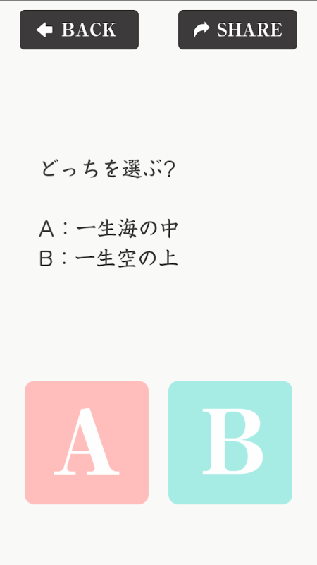 タップ後、質問が表示されます。質問に対しての回答は「A」「B」のボタンでお答えくださいね!