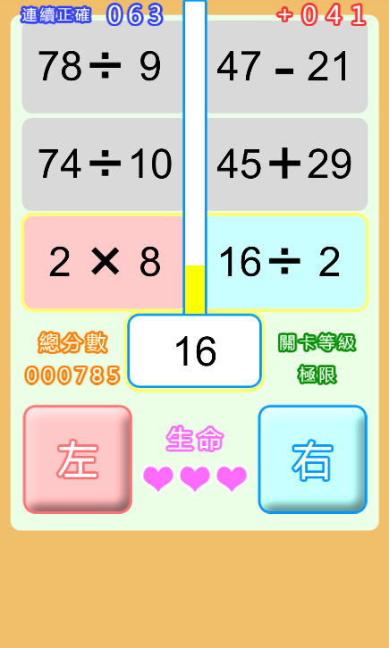 遊戲說明:根據畫面中間的數字,判斷出上方相等於此中間數字的算式,選擇出正確答案的那個方向,當玩家選擇出正確的答案後,關卡等級以及總分數也會相對的增加。