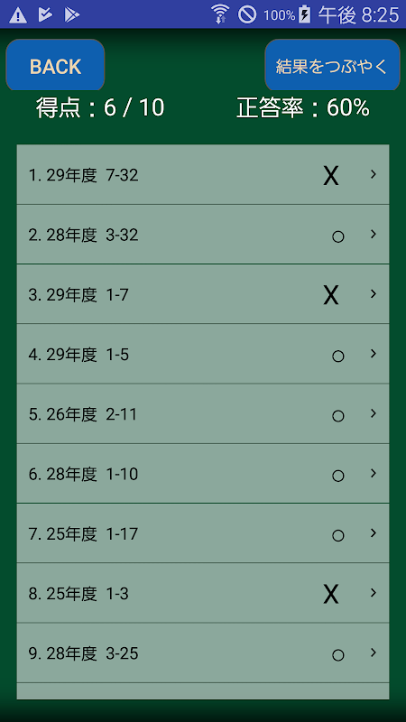 「設定」ボタンの「問題数」で指定した数の問題を回答すると、結果画面に移ります。