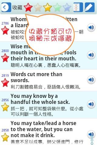 本軟體提供快速收尋功能,只要任一個關件字(中文及英文皆可)就可快速找到你想學習的諺語。並且提供收藏功能讓你快速回顧及復習。