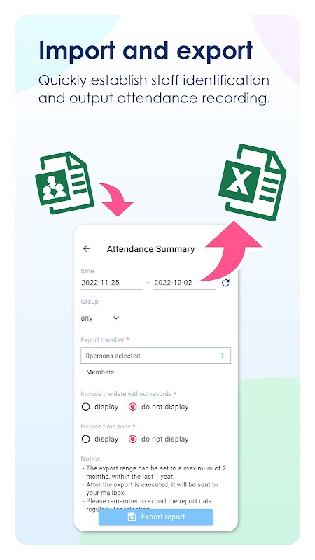 আপনার নিজের পিসিতে কাজের সময়গুলি পরিচালনা করতে বা কাজের জন্য জমা দিতে ই-মেইলের মাধ্যমে টাইমশীট রপ্তানি করুন৷ খণ্ডকালীন কর্মীদের জন্য আগে থেকে বেতন চেকগুলি বের করাও সুবিধাজনক৷