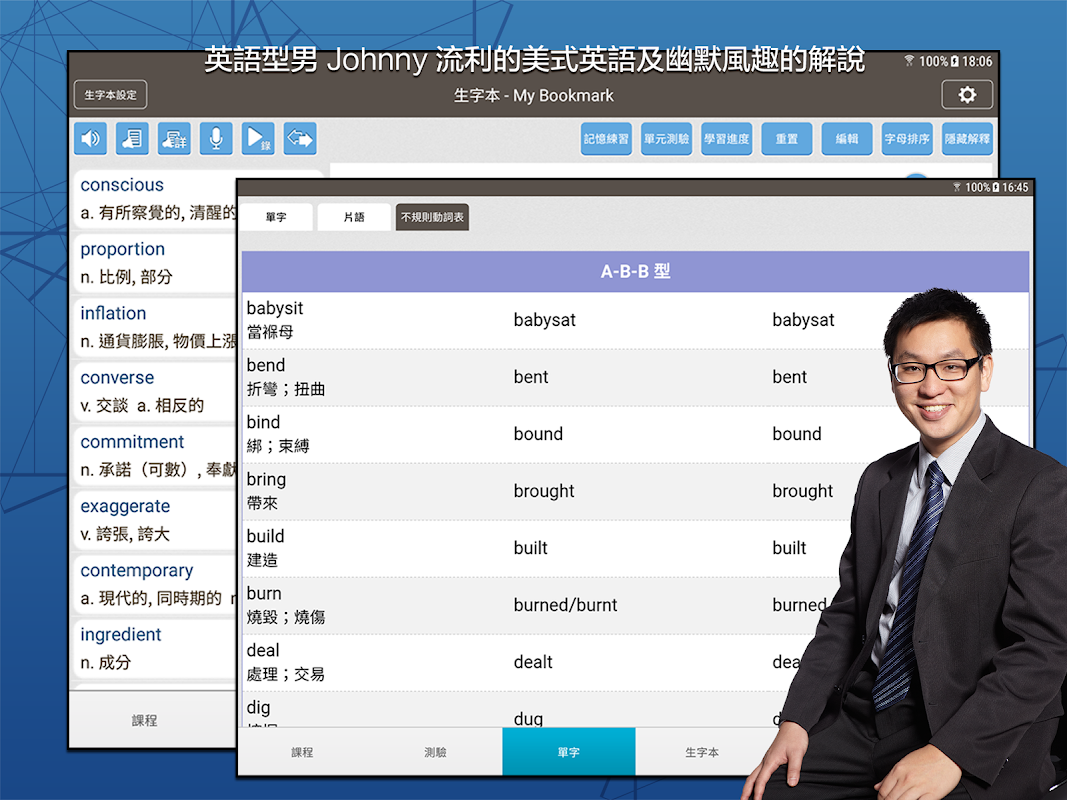 本 app 課程內容搜集四級擬真考題高頻單字片語及用法。課程內容秉持賴老師一貫嚴謹態度,單字解說詳盡,內容豐富,包含片語、衍生字、同/反義字、容易混淆字、和搭配用法等說明,單字與例句也均有道地美式發音。本課程的另一大特色是由新生代英語型男 Johnny 以流利的美式英語為同學們講解單字用法,通過幽默風趣的教學方式能讓學習效率加倍,絕不枯燥!