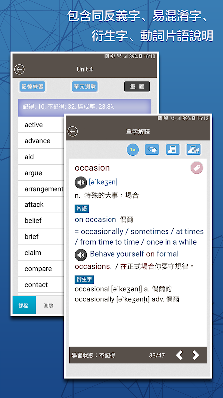 專為增強學習效果設計的記憶練習和測驗練習,讓您背單字更有效率也更容易!支援連續播放及背景播放功能,讓您有效利用零碎時間增強自己的單字功力。本 app 內容翔實,功能實用,是您提升英文單字實力最佳工具!