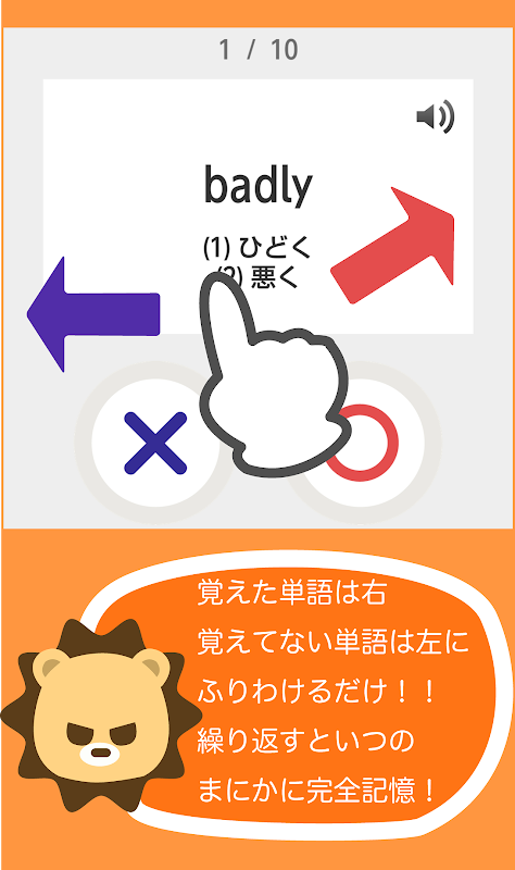 分かる単語は右へ、分からない単語は左へスワイプするだけ!