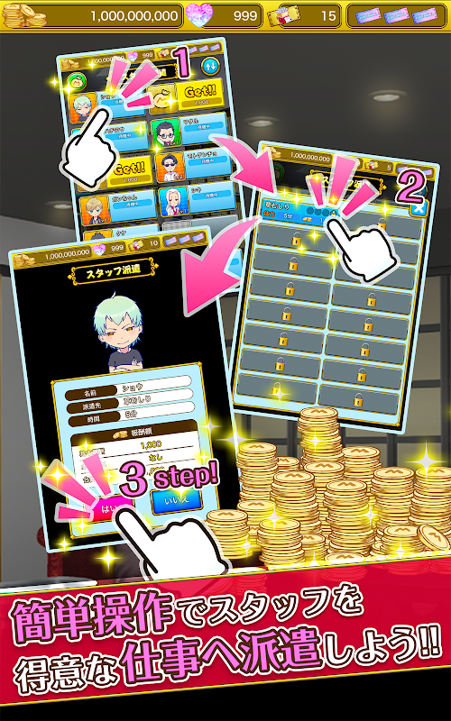 スタッフを育成すると放置しても簡単にお金が稼ぐ事ができます。