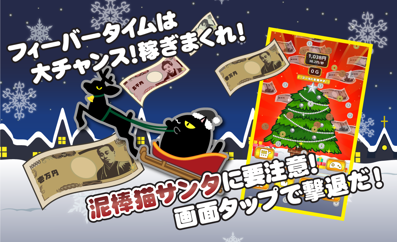 7.たまに出現する泥棒猫サンタは放っておくとお金を盗んでいきます。タップで撃退しましょう。