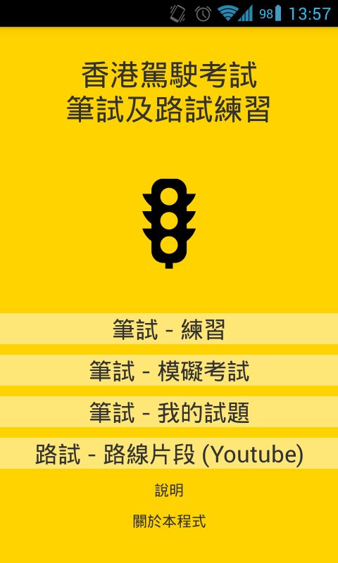 香港駕駛執照練習 ( 筆試及路試 ) 程式內包含了三百多條題目,多遵從運輸署的《道路使用者守則》,同時參巧網上所找到的類近測驗,以增加其準確性,希望能為考車牌的使用者帶來更好的溫習效果。
