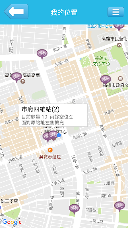 我的位置:一點選進去即可在地圖上找到我的位置及10條特定景點的單車路線。另外,也提供全市單車路線、City Bike租借點、旅館、景點等資料。點選地圖上的任一City Bike租借點,可查知單車目前數量、尚餘空位等資料。