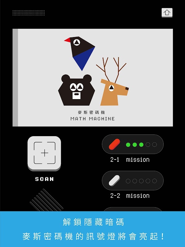 開啟麥斯密碼機上的相機進入數學任務的挑戰,每道題目解題成功其麥斯密碼機上的訊號將會亮起,並獲得一個隱藏暗碼,當三個任務章節中的五個訊號皆亮起,就能依循所搜集的暗碼獲得一個神秘彩蛋。成功解鎖三個神秘彩蛋時,代表著你成功解救森林,並且將有機會成為台灣特種部隊的一員!