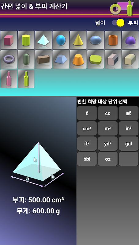 상단부의 스위치를 토글할 때마다 넓이 또는 부피로 선택 대상 항목을 바꿀 수 있습니다.