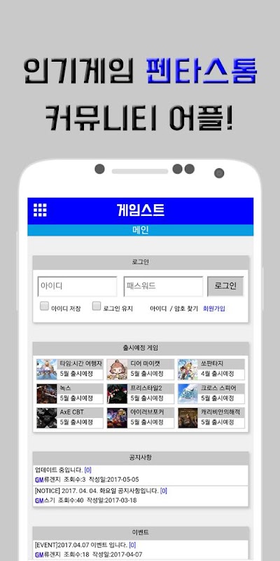 해당 어플은 인기게임 펜타스톰의 편리한 커뮤니티 어플리케이션입니다.